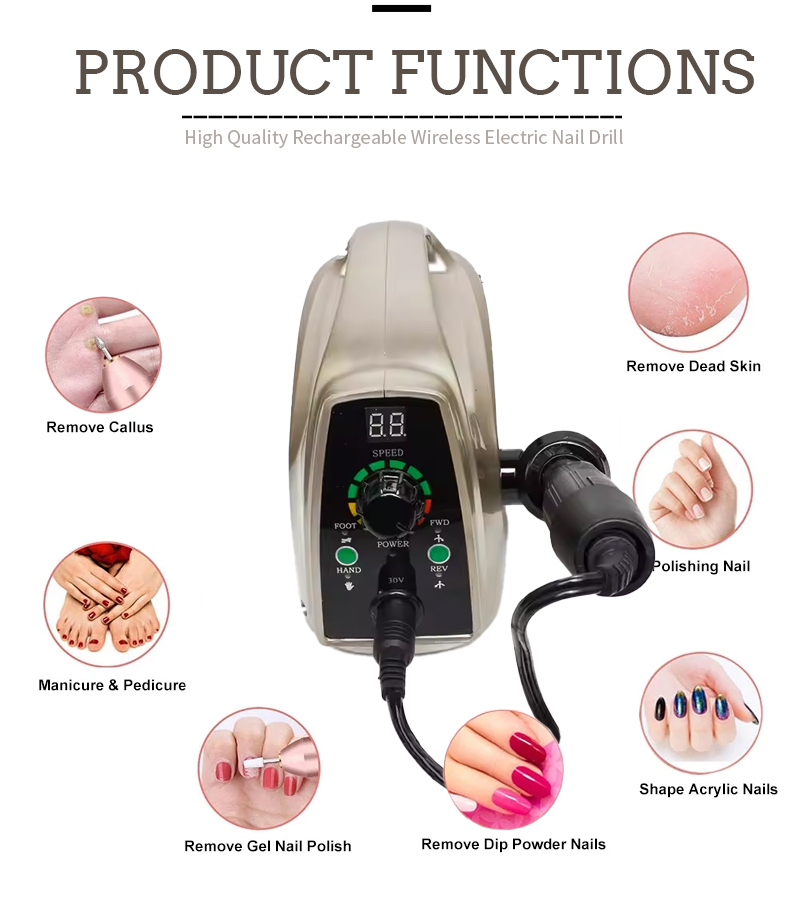 คุณลักษณะของผลิตภัณฑ์และการใช้ตะไบเล็บไฟฟ้าไร้สายพร้อมที่จับ
