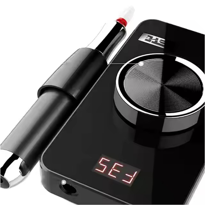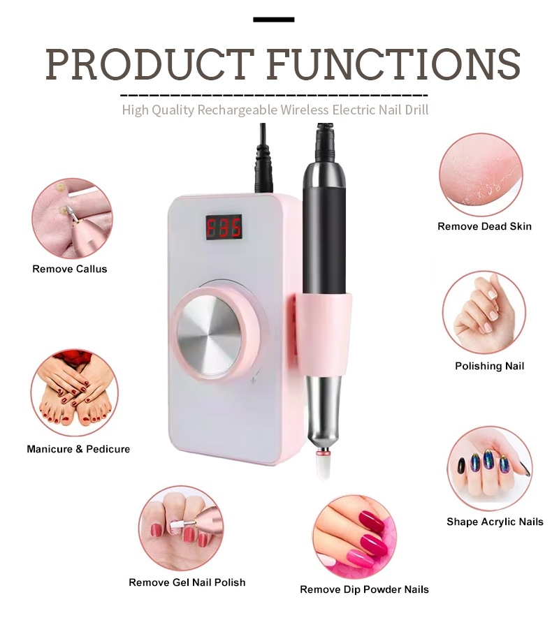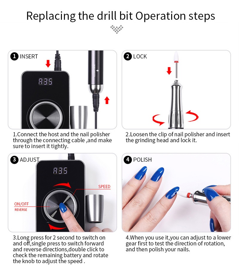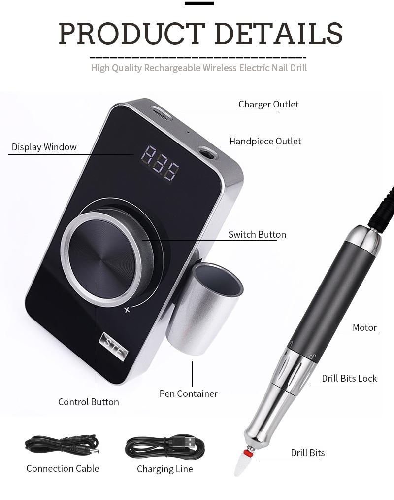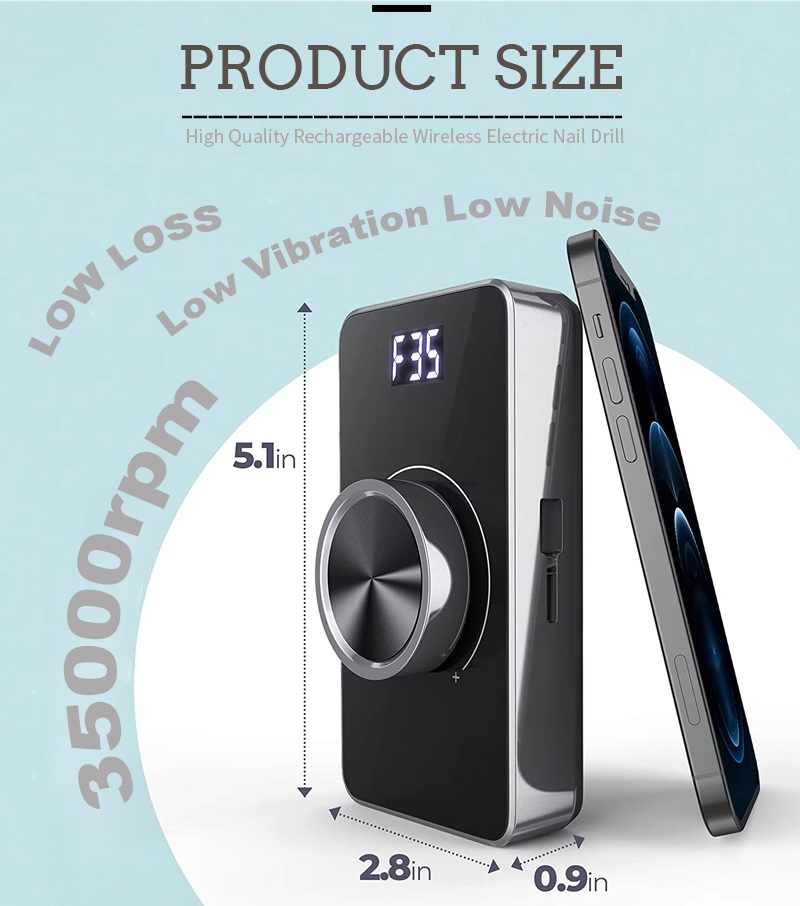 การออกแบบจอแสดงผลของสว่านเล็บไฟฟ้าขัดผิวความเร็ว 35,000 รอบต่อนาทีนี้มีสวิตช์เปิด/ปิดและการหมุนไปข้างหน้า/ย้อนกลับสำหรับการเปิดใช้งานด้วยปุ่มเดียว ช่องเสียบชาร์จด่วนที่ด้านล่าง ช่องเสียบสว่านแบบเปลี่ยนได้ที่ด้านบน และความเร็วที่ปรับได้สามตำแหน่งเพื่อตอบสนองความต้องการที่หลากหลาย