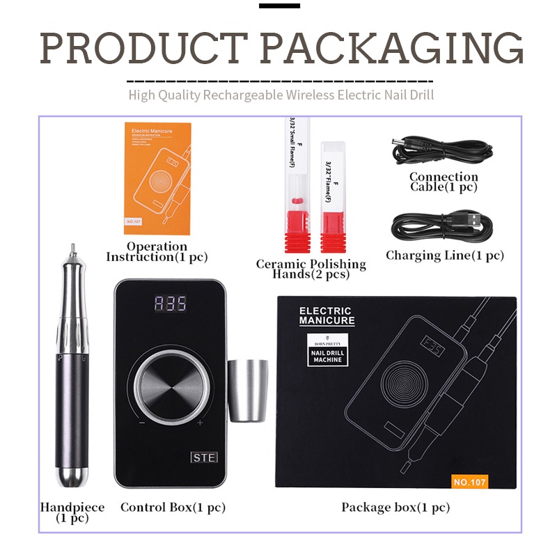 เนื้อหาในแพ็คเกจสว่านเล็บไฟฟ้าขัดผิว 35,000 รอบต่อนาทีนี้ประกอบด้วยผลิตภัณฑ์ปากกาขัด สายชาร์จ USB คู่มือการใช้งานผลิตภัณฑ์ และกล่องน้ำหนักเบาและพกพาได้