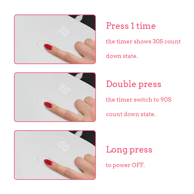 โคมไฟอบเล็บขนาดเล็กแบบพับได้มีเทคโนโลยีเซ็นเซอร์อินฟราเรดอัจฉริยะที่จะส่องสว่างโดยอัตโนมัติเมื่อมือเข้าใกล้และปิดเมื่อมือเคลื่อนออกไป ลดความยุ่งยากในการกดปุ่มซ้ำ ๆ และประหยัดเวลาและแรง กาวอบกำลังสูงไม่ต้องรอนาน ประหยัดทั้งแรงและเวลา