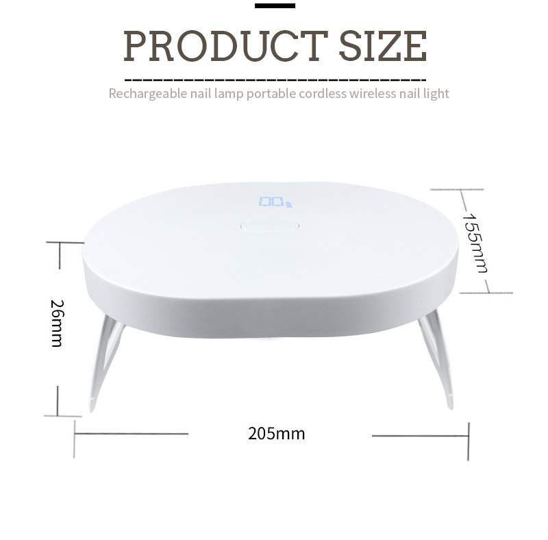 ขนาดของโคมไฟอบเล็บขนาดเล็กแบบพับได้มีความยาว 205 มม. กว้าง 155 มม. และสูง 26 มม. มีความจุขนาดใหญ่และสามารถใช้งานทั้งมือและเท้าได้ซึ่งสะดวกมาก