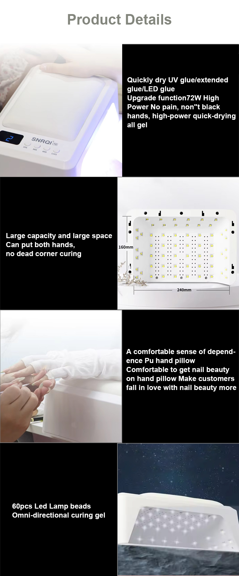 ผลิตภัณฑ์ช่วยให้กาวแห้งสนิทโดยไม่หดตัว แหล่งกำเนิดแสงคู่ให้ความร้อนอย่างอ่อนโยนเพื่อป้องกันมือเปลี่ยนสีและปวดตา เหมาะสำหรับทั้งมือและเท้า ให้ผลลัพธ์ที่แห้งเร็วอย่างน่าทึ่ง
