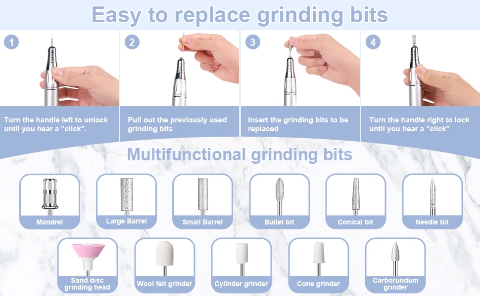 วิธีดำเนินการเปลี่ยนสว่านเล็บแบบพกพาเสียงรบกวนต่ำชุดนั่นคือเสียบและดึงออกง่ายและสะดวกสามารถเปลี่ยนได้หลังจากเสร็จสิ้น