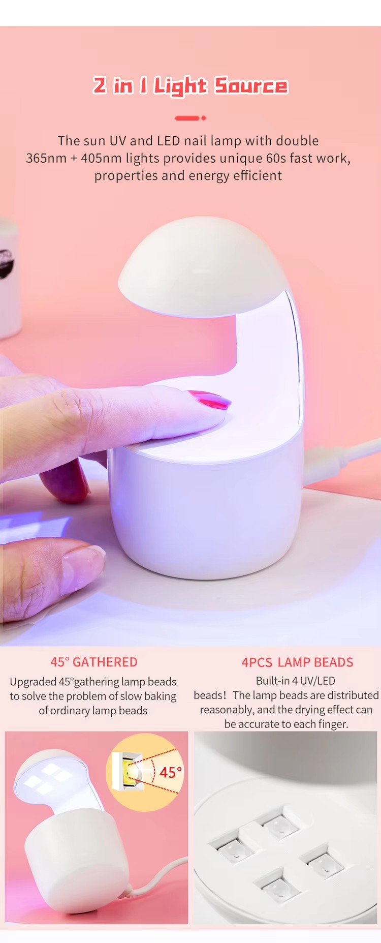 1)หลอดไฟเดียวแบบไร้สายแบบชาร์จไฟได้ 8W ผลิตภัณฑ์มี 4 UV/LED นำเข้าชิปโคมไฟขนาดใหญ่, 1 อันดับแรกของประสิทธิภาพ 8 วินาทีเพื่อให้แห้งทาเล็บสี, 12 วินาทีเพื่อให้ชั้นปิดผนึกของทาเล็บ ความยาวคลื่นของลูกปัดโคมไฟ (365 + 405Nm) กาวอบพลังงานสูงโดยไม่มีจุดสิ้นสุดตายกำลังสูง