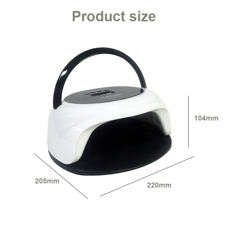 ขนาดของโคมไฟอบเล็บพร้อมฟังก์ชั่นเซ็นเซอร์อัตโนมัติ มีความยาว 205 มม. กว้าง 220 มม. สูง 104 มม. มีความจุขนาดใหญ่และสามารถใช้งานทั้งมือและเท้าได้สะดวกมาก