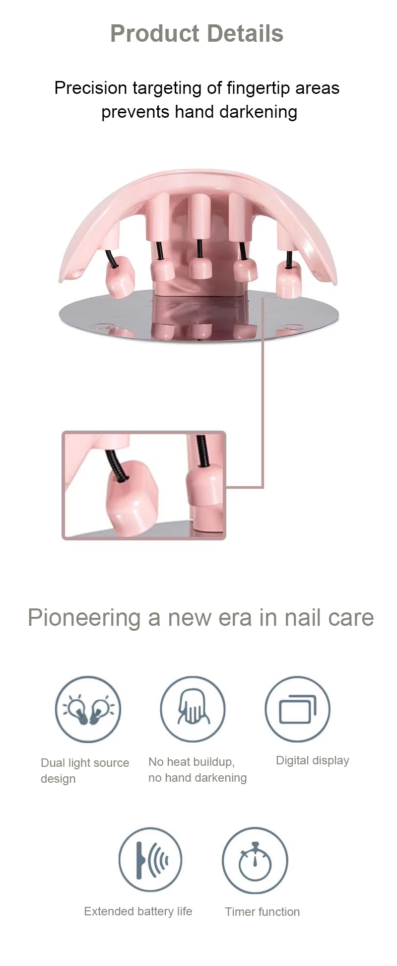ผลิตภัณฑ์ช่วยให้กาวแห้งสนิทโดยไม่หดตัว แหล่งกำเนิดแสงคู่ให้ความร้อนอย่างอ่อนโยนเพื่อป้องกันมือเปลี่ยนสีและปวดตา เหมาะสำหรับทั้งมือและเท้า ให้ผลลัพธ์ที่แห้งเร็วอย่างน่าทึ่ง