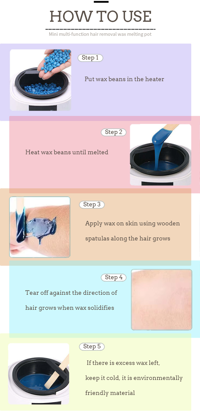 ผลิตภัณฑ์ depilatory WAX วิธีการดำเนินงาน,อุณหภูมิที่สูงขึ้นได้เร็วขึ้นขี้ผึ้งละลาย, ลดอุณหภูมิช้าลงขี้ผึ้งละลาย,First Pour ในปริมาณที่เหมาะสม depilatory WAX ถั่ว,เครื่องทำความร้อนจนกว่าขี้ผึ้งถั่วละลาย, then depilatory ชิ้นส่วนของสม่ำเสมอเคลือบ depilatory WAX และสุดท้ายกับทิศทาง of hair Growth ฉีกขาด