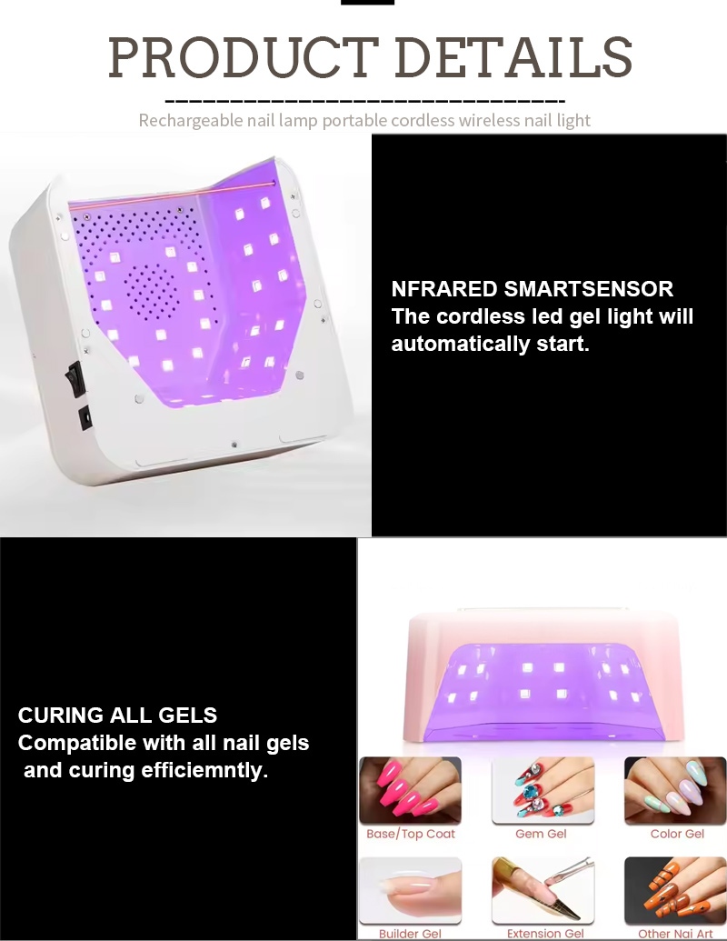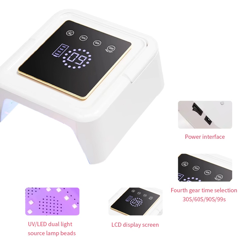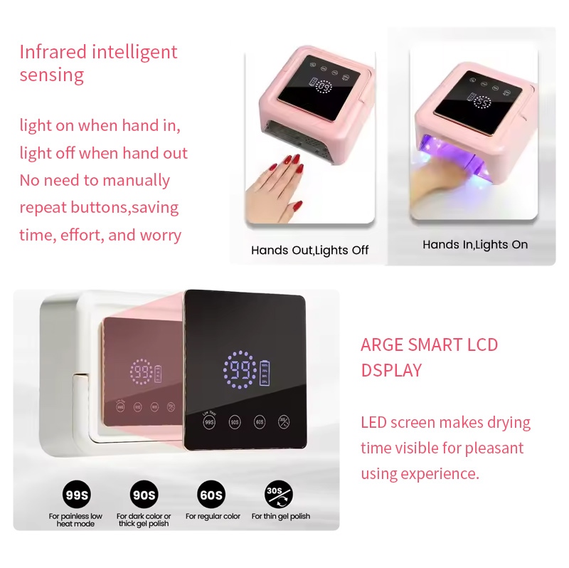 โคมไฟเป่าเล็บทรงสี่เหลี่ยมมีเทคโนโลยีการตรวจจับอัจฉริยะแบบอินฟราเรดที่จะส่องสว่างโดยอัตโนมัติเมื่อมือเข้าใกล้และปิดเมื่อมือเคลื่อนออกไป—ช่วยลดความยุ่งยากในการกดปุ่มซ้ำ ๆ และประหยัดเวลาและแรง กาวอบกำลังสูงไม่ต้องรอนาน ประหยัดทั้งแรงและเวลา
